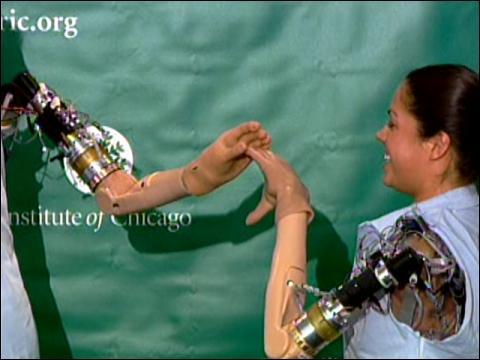 Dr. Todd Kuiken of the Rehabilitation Institute of Chicago developed the "bionic arm". It's connected to the brain by healthy motor nerves that used to run into the patient's missing limb. These are then re-routed to other areas of the body, like the chest, where the nerve impulses they carry can be picked up by electrodes in the bionic arm. A patient can think about moving their hand, this sends the nerves that would have been sent to the real hand to the prosthetic one!