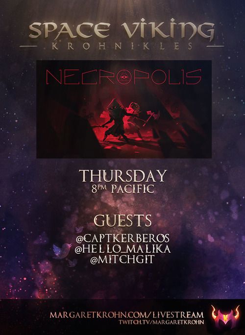 Space Viking Krohnikles (SVKrohn) is a web-series that journeys into a new virtual world every week on Thursday at 8PM Pacific on Twitch.TV/MargaretKrohn, covering first impressions, gameplay and afterthoughts. Each episode starts with a get-to-know the cast intro, providing viewers with an insight into the mind(s) of that week's guest(s), and recently played games.